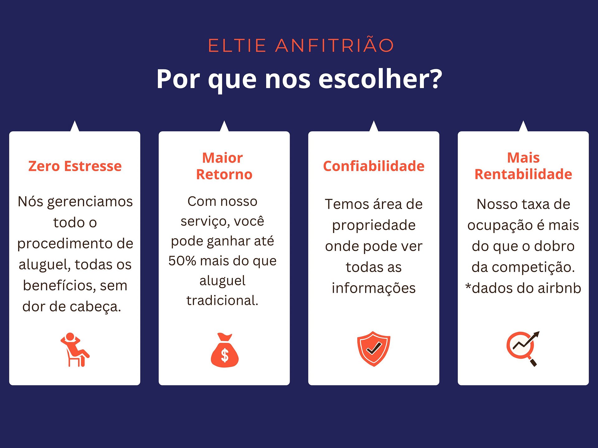 Para garantir uma experiência de qualidade aos hóspedes e bons retornos aos anfitriões, temos requisitos mínimos para imóveis. Entre em contato com nossa equipe para saber se seu imóvel é adequado. Também damos assessoria para ajudá-lo a deixar seu imóvel pronto e equipado para receber hóspedes.